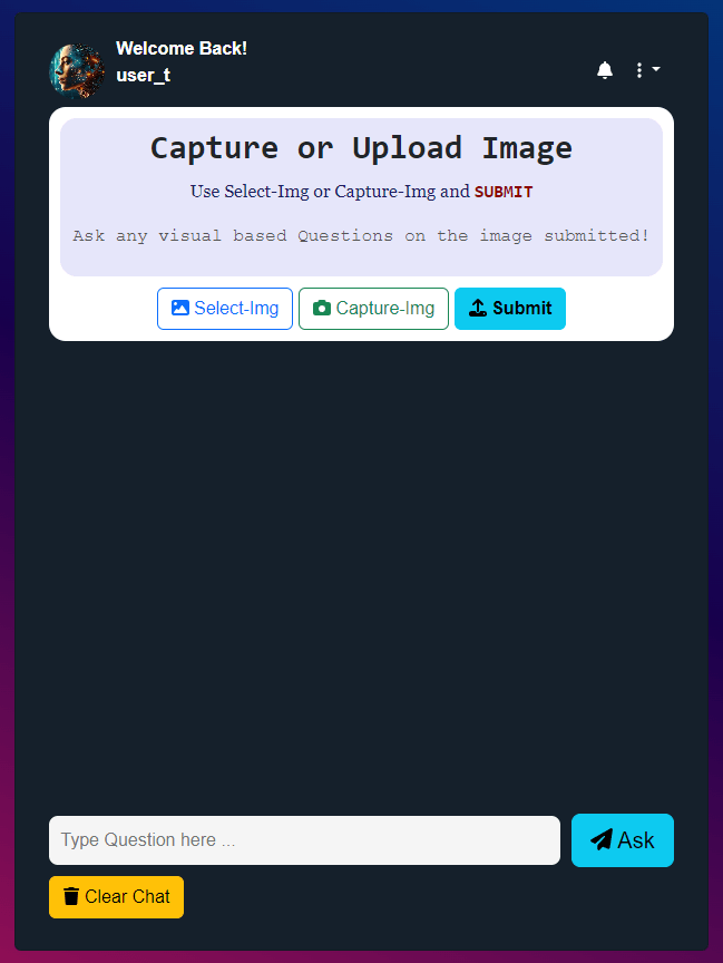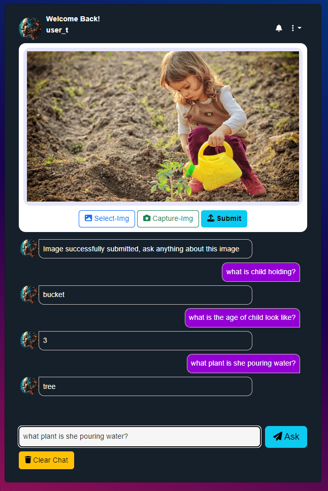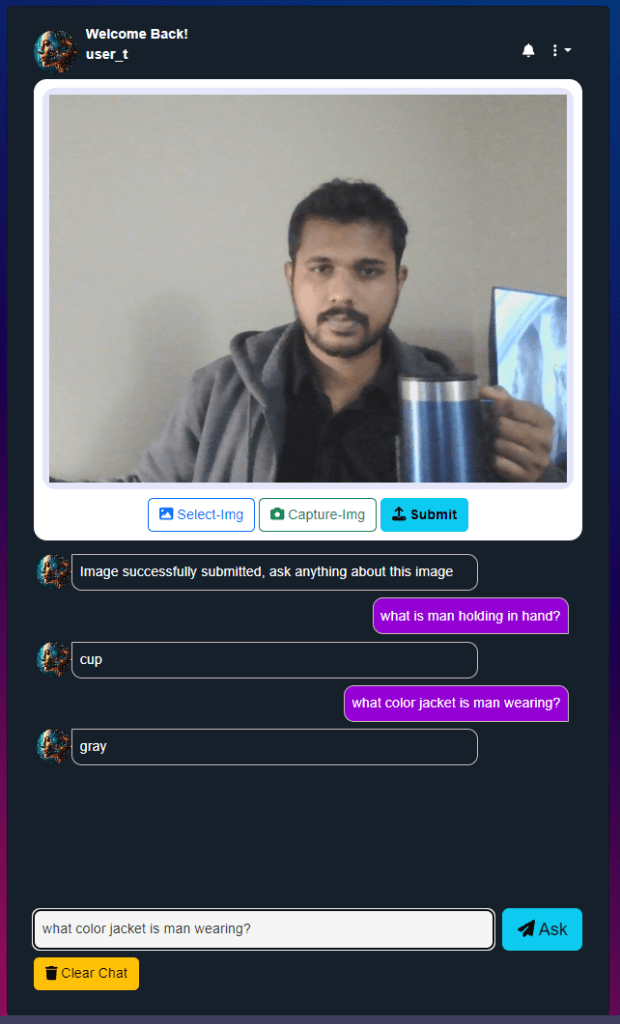 - System Responds with an Answer generated by the VQA Model and displayed as chat reply.